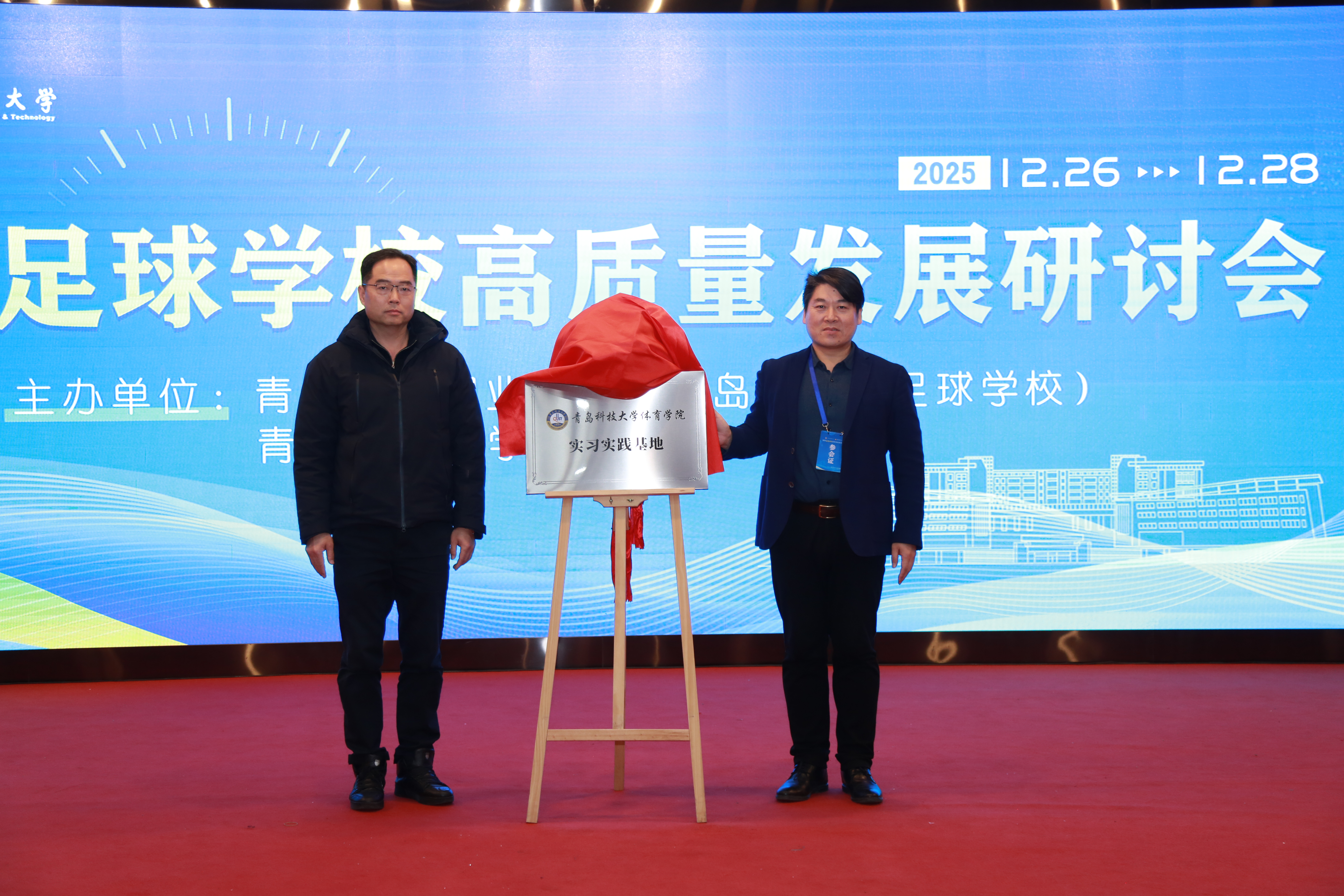 青岛财经职业学校副校长王海舰与青岛科技大学体育学院副院长孙中丰共同为实习实践基地揭牌。